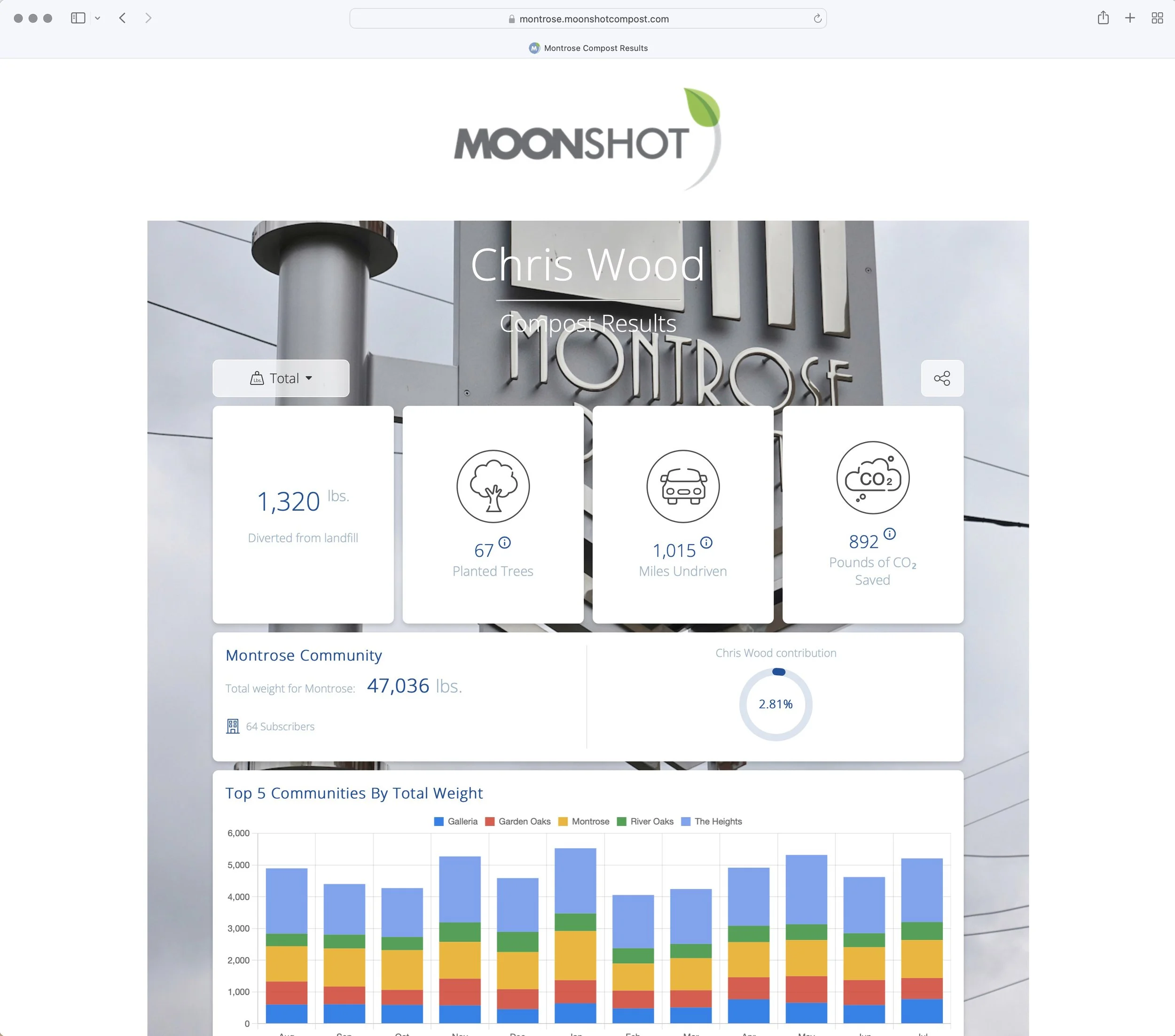 At Moonshot Compost, one of our core values is transparency - individuals should be provided with accurate and up-to-date data about the food waste they are diverting from landfills. That’s why we developed our proprietary Diversion Dashboard software.